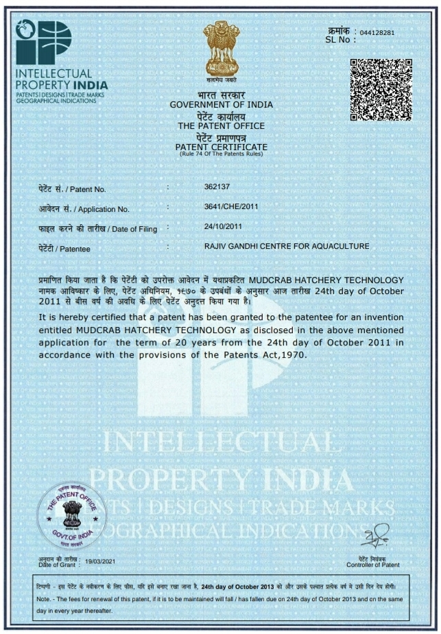 RGCA-Mud crab project obtained PATENT for Mud-crab Hatchery Technology